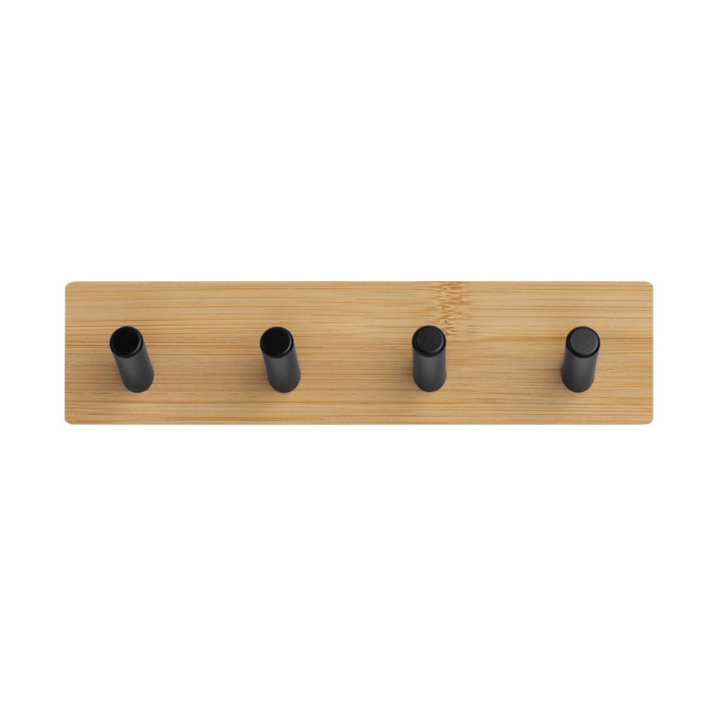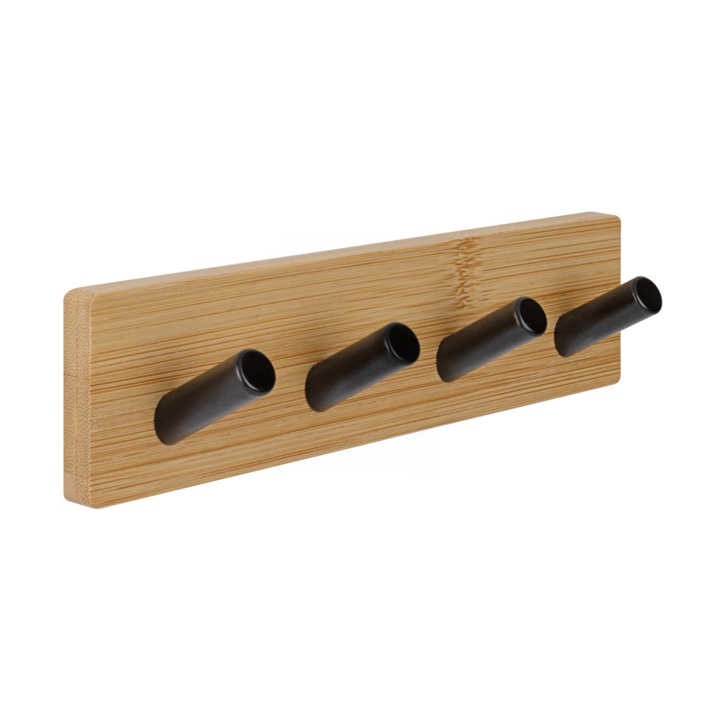 Bambusová samolepicí lišta se čtyřmi černými kovovými háčky – 180 × 45 × 30 mm | FSC® certifikace