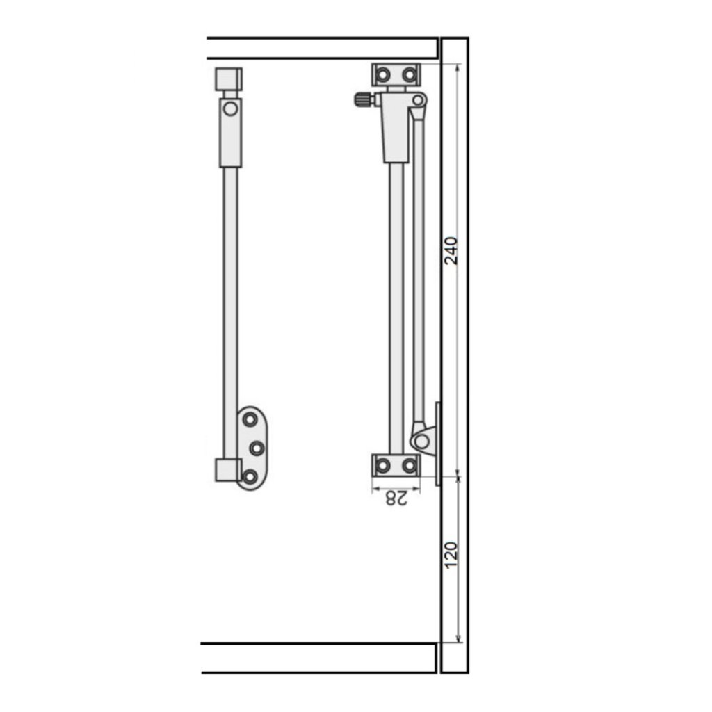 Kvalitně zpracovaná brzda sklopných dvířek pro levou stranu o délce 275 mm.