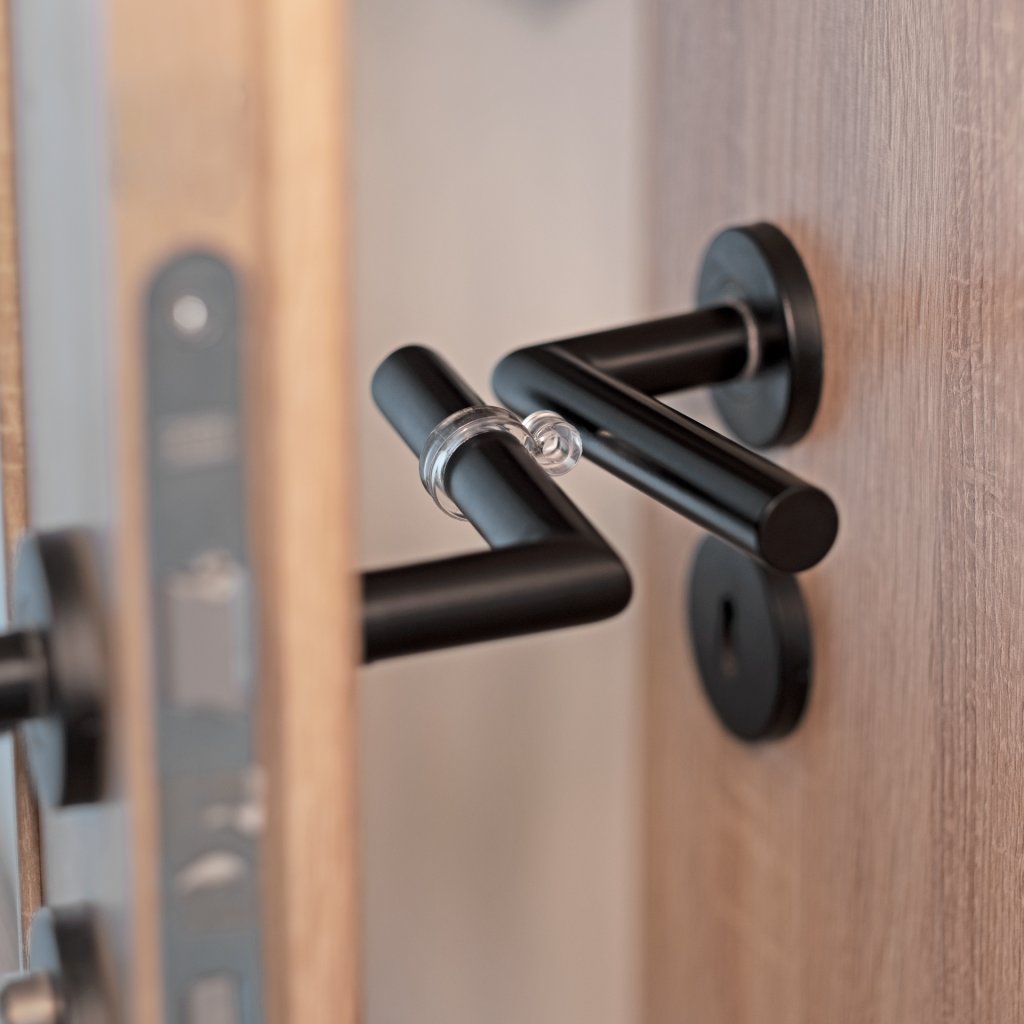 Jednoduchá montáž: Není zapotřebí žádné nářadí! Zarážku jednoduše navléknete na kliku a posunete do požadované polohy, hotovo.