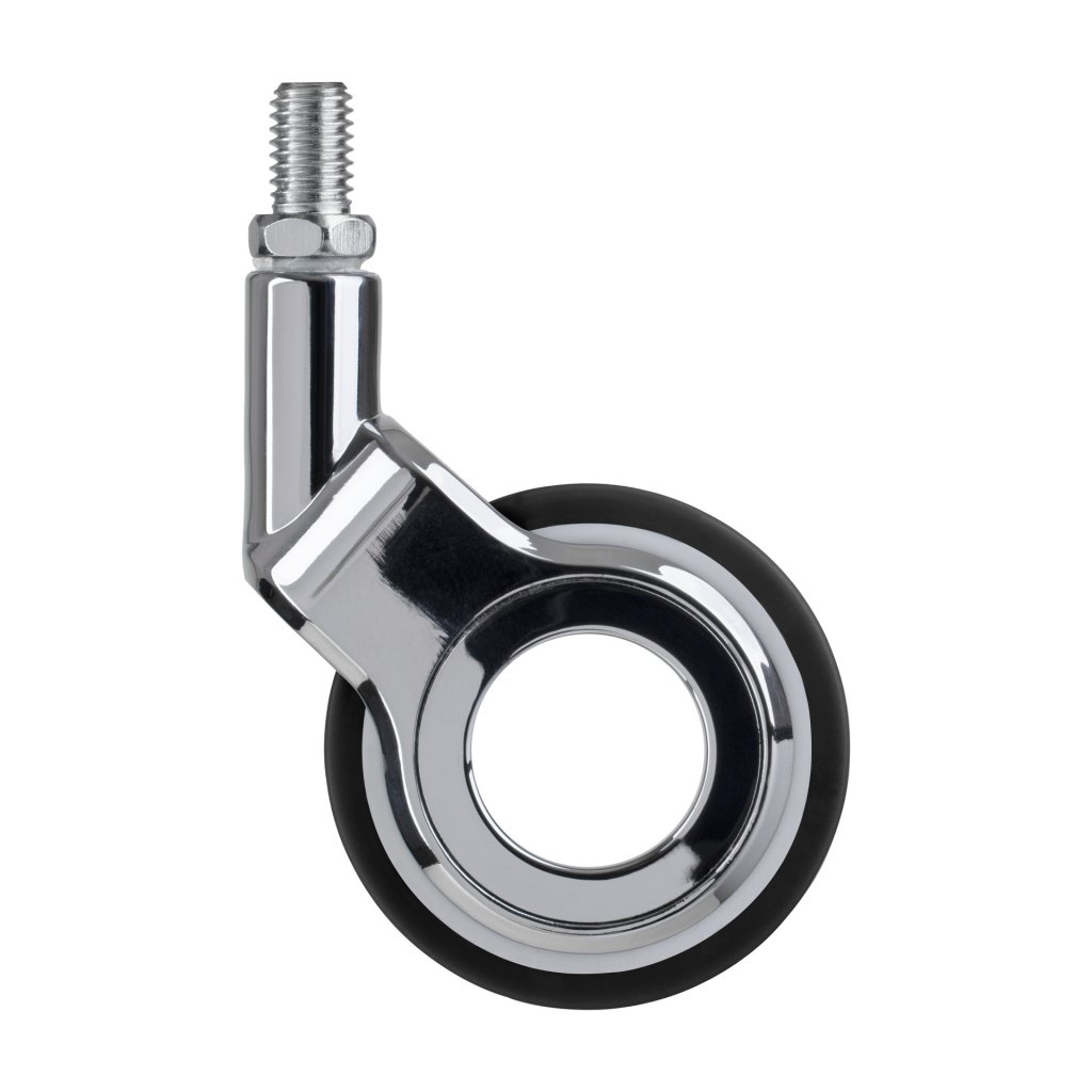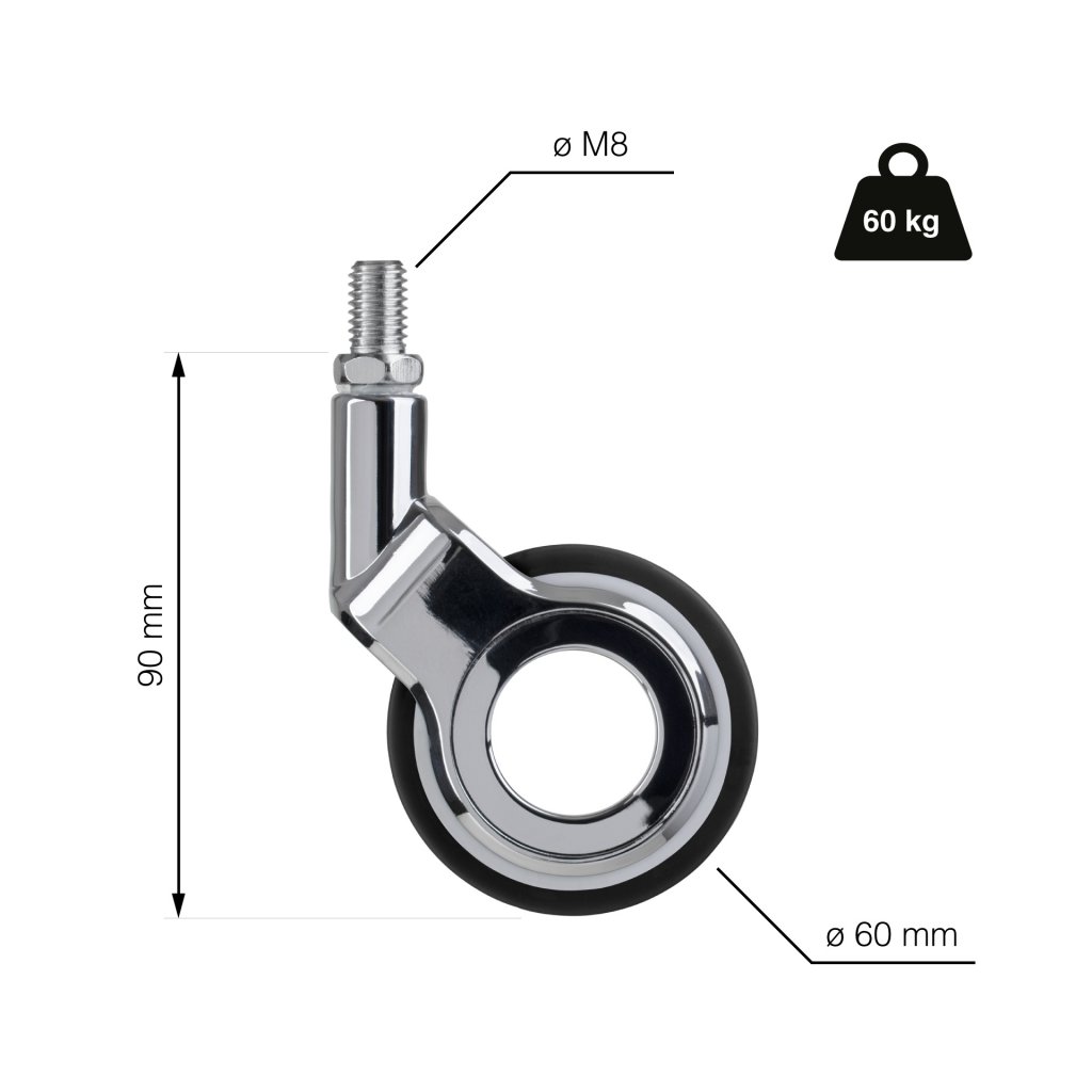 Designové nábytkové kolečko o průměru 60 mm a závitem M8 s dynamickou nosností do 60 kg vhodné k uchycení na nábytek. Kolečka pro tvrdé podlahy jako jsou dlažby, dřevěné plovoucí podlahy, průmyslové podlahy.