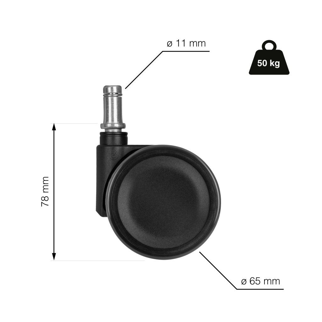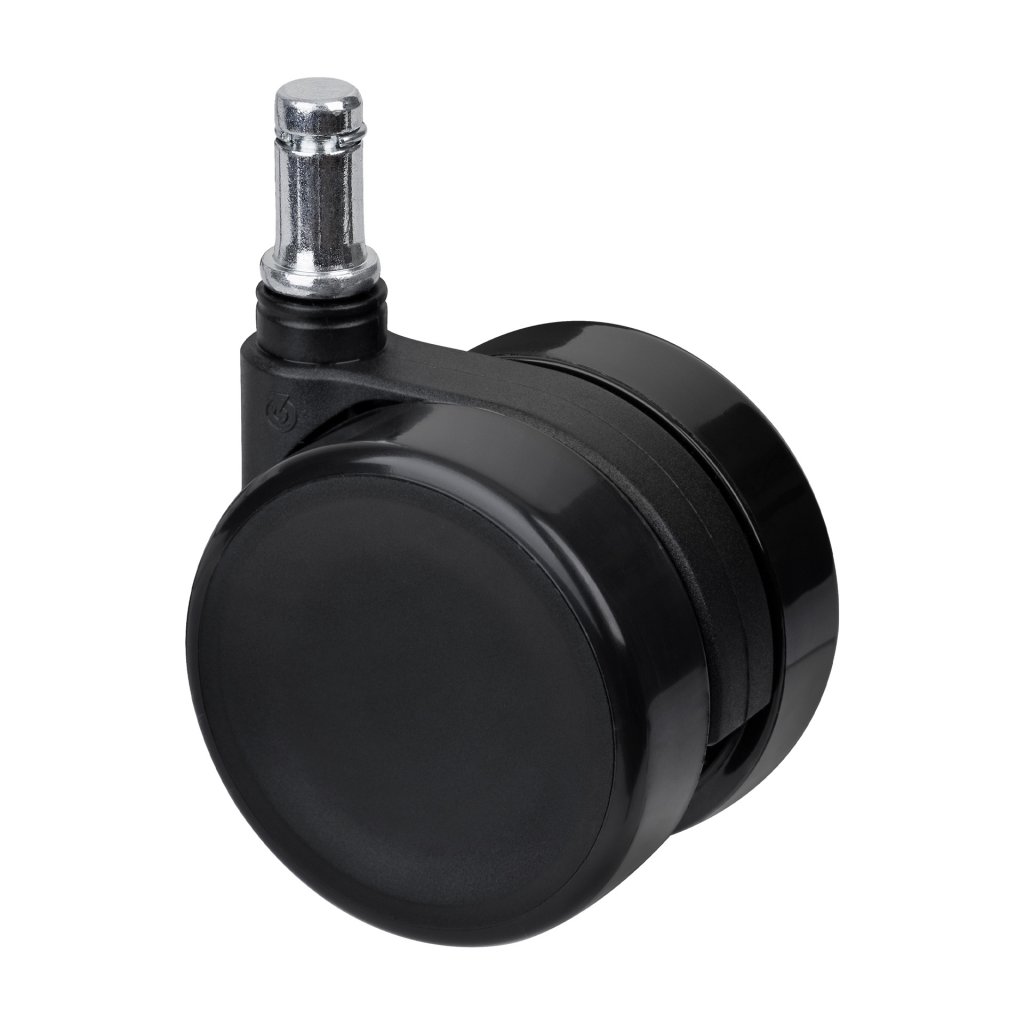 Černé designové nábytkové kolečko s čepem o průměru 65 mm s dynamickou nosností do 50 kg. Kolečka pro tvrdé podlahy jako jsou dlažby, dřevěné plovoucí podlahy, průmyslové podlahy.