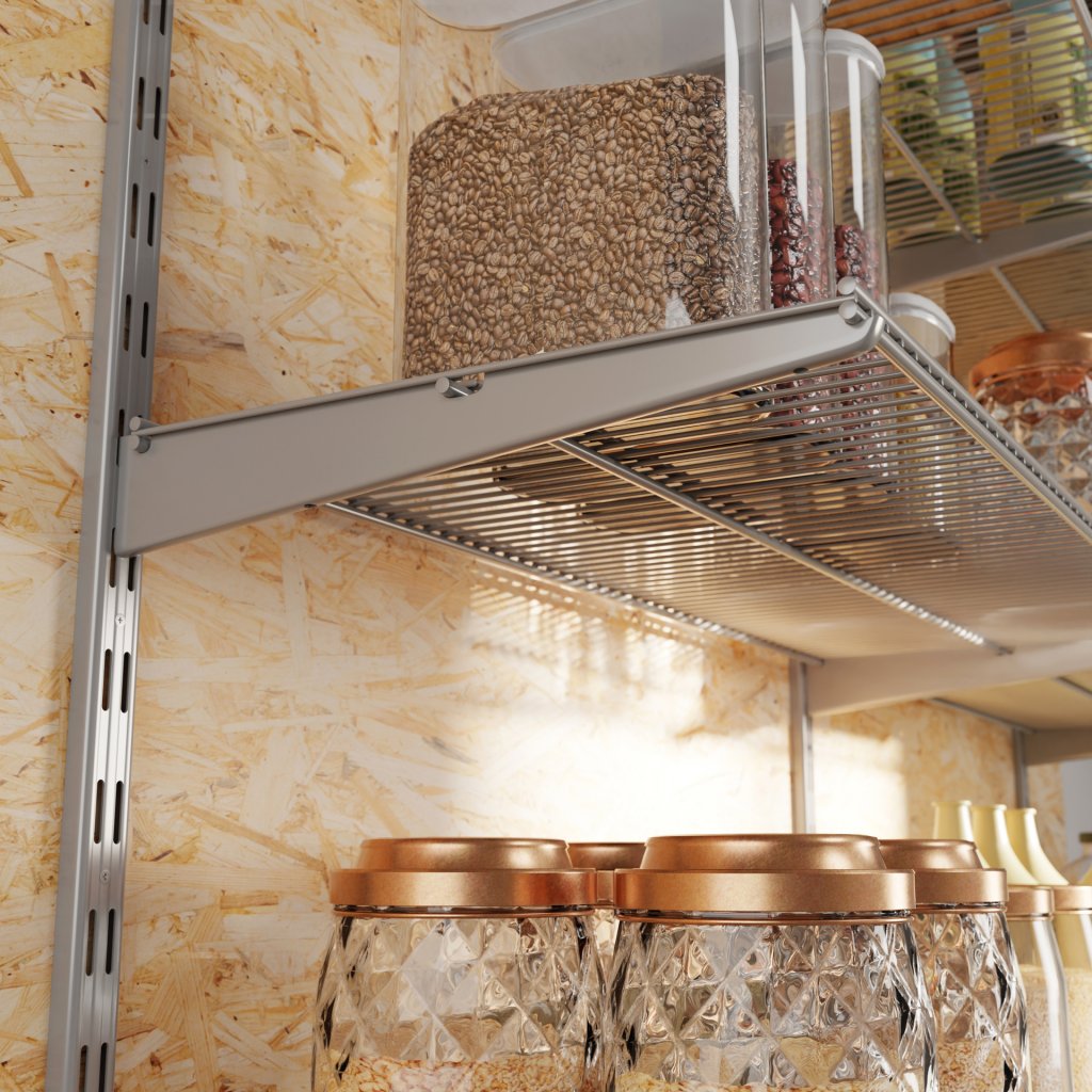Pro správnou montáž je nutné polici kombinovat se dvěma nosníky pro drátěné police, které mají přesně tvarované výřezy. Instalace je velmi snadná – police se jednoduše zasune do výřezů v nosnících a zacvakne se, takže pevně drží a nehrozí její sklouznutí. Tento systém nevyžaduje žádné další šroubování ani složité upevnění.