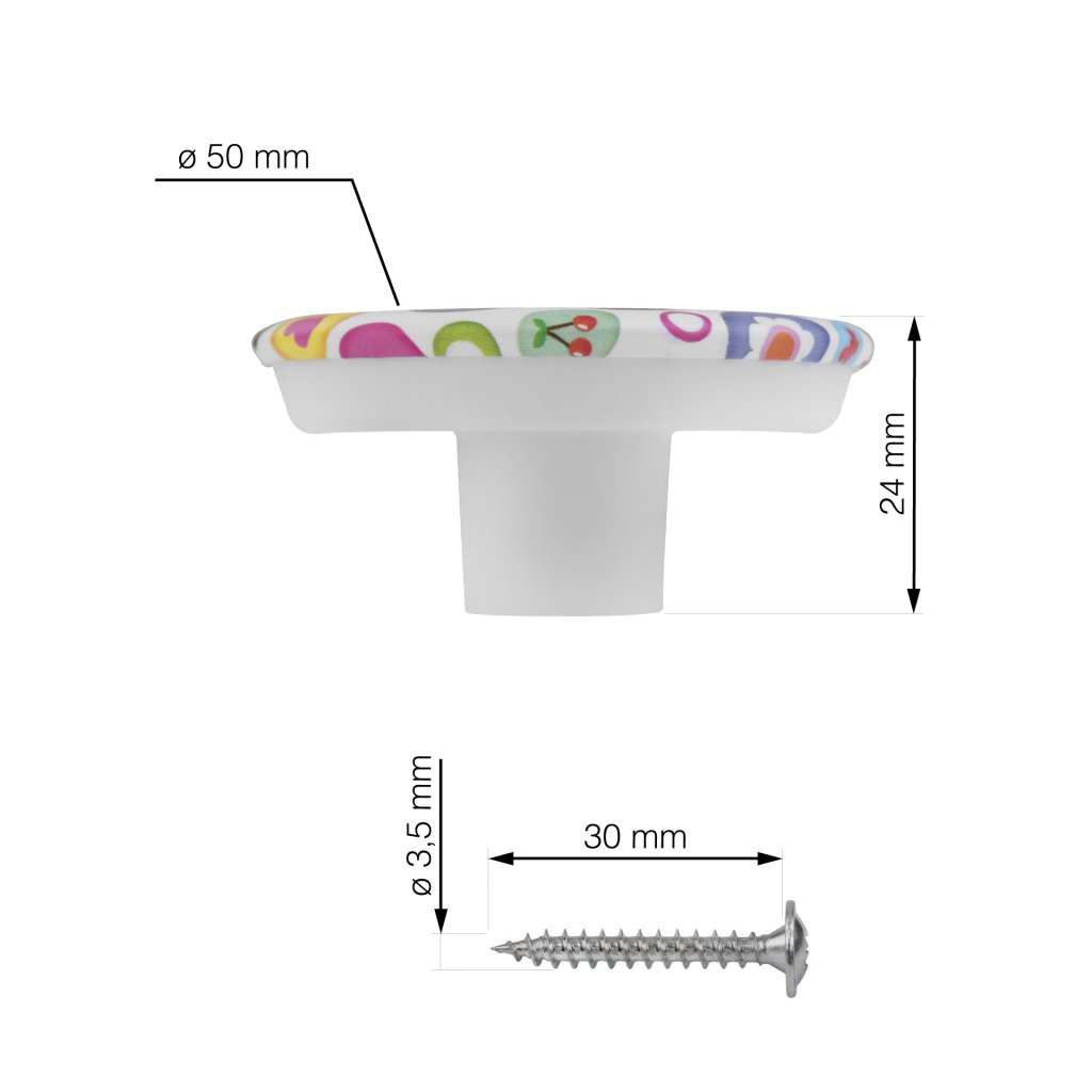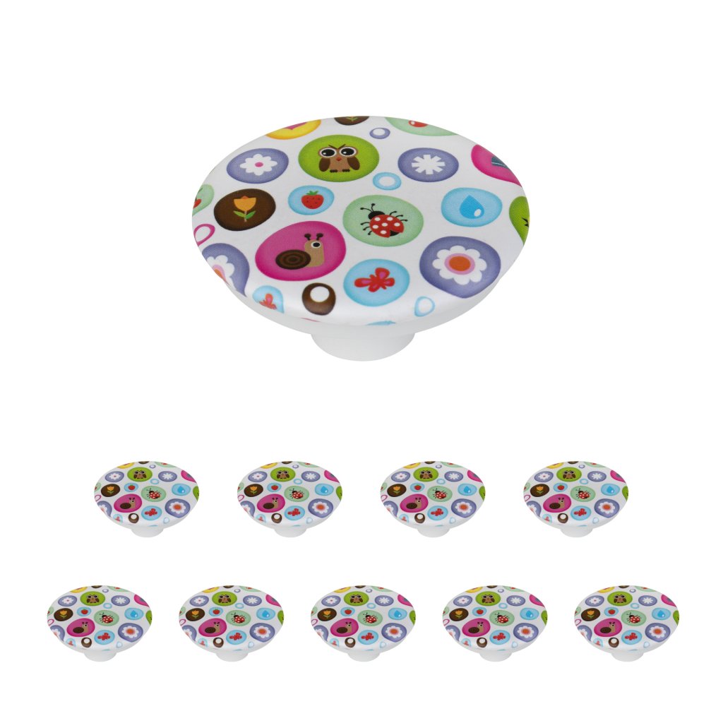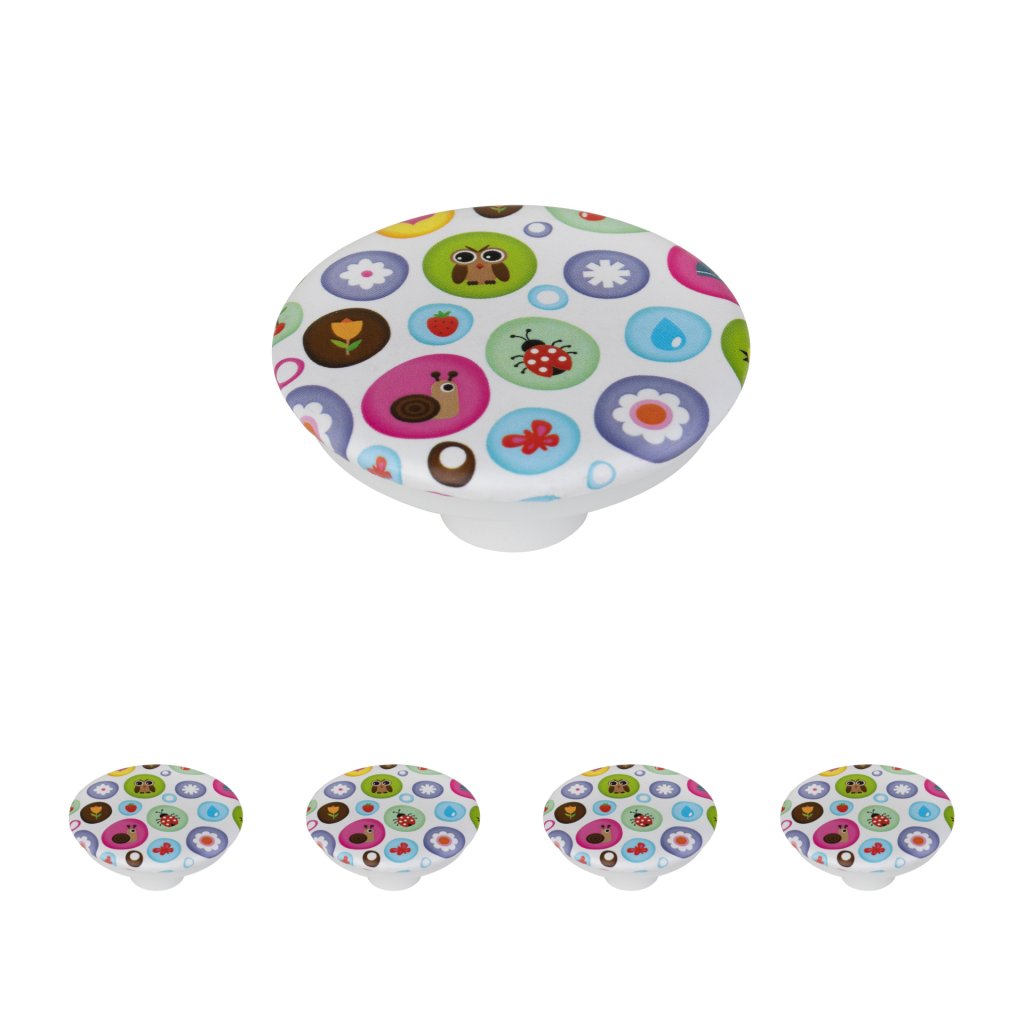 Dětské nábytkové knopky nejčastěji využívané na bílé komody a skříně v dětských pokojích. Obecně ladí se světlými dekory dřeva nebo s barevnostně podobnými jako jsou na knopkách.