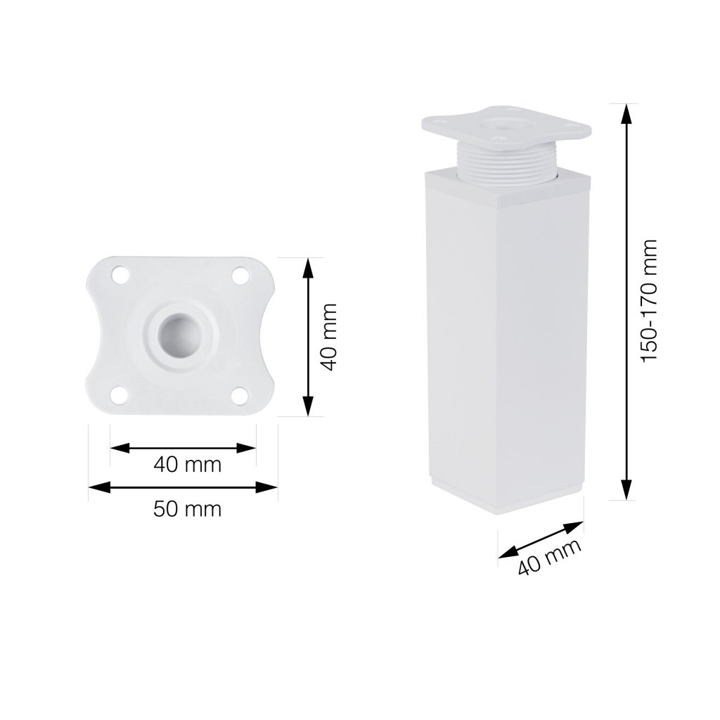 Hranatá plastová nábytková noha v bílém provedení s nastavitelnou výškou je ideální na vyrovnání či přizpůsobení se nerovným povrchům/podlahám.