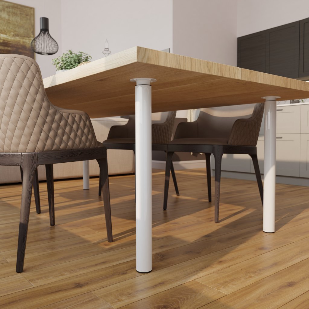 Kulatá ocelová nábytková noha v bílém provedení dodá Vašemu nábytku elegantní industriální vzhled. Výškové nastavení nábytkových nohou umožňuje uzpůsobit si libovolně výšku Vašeho nábytku. Základní část nábytkové nohy do výšky 700 mm je o průměru 60 mm. Součást nábytkové nohy, kterou lze vyšroubovat do výšky 1100 mm, je o průměru 50 mm.