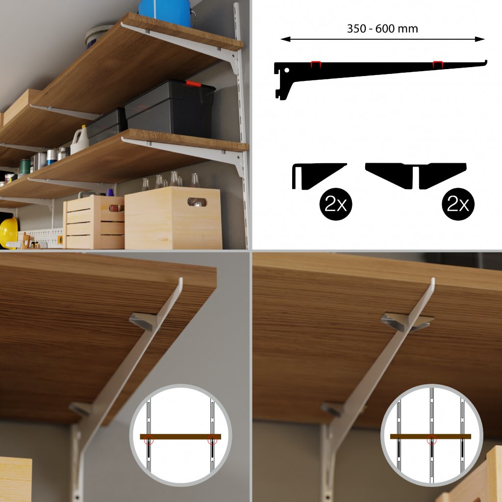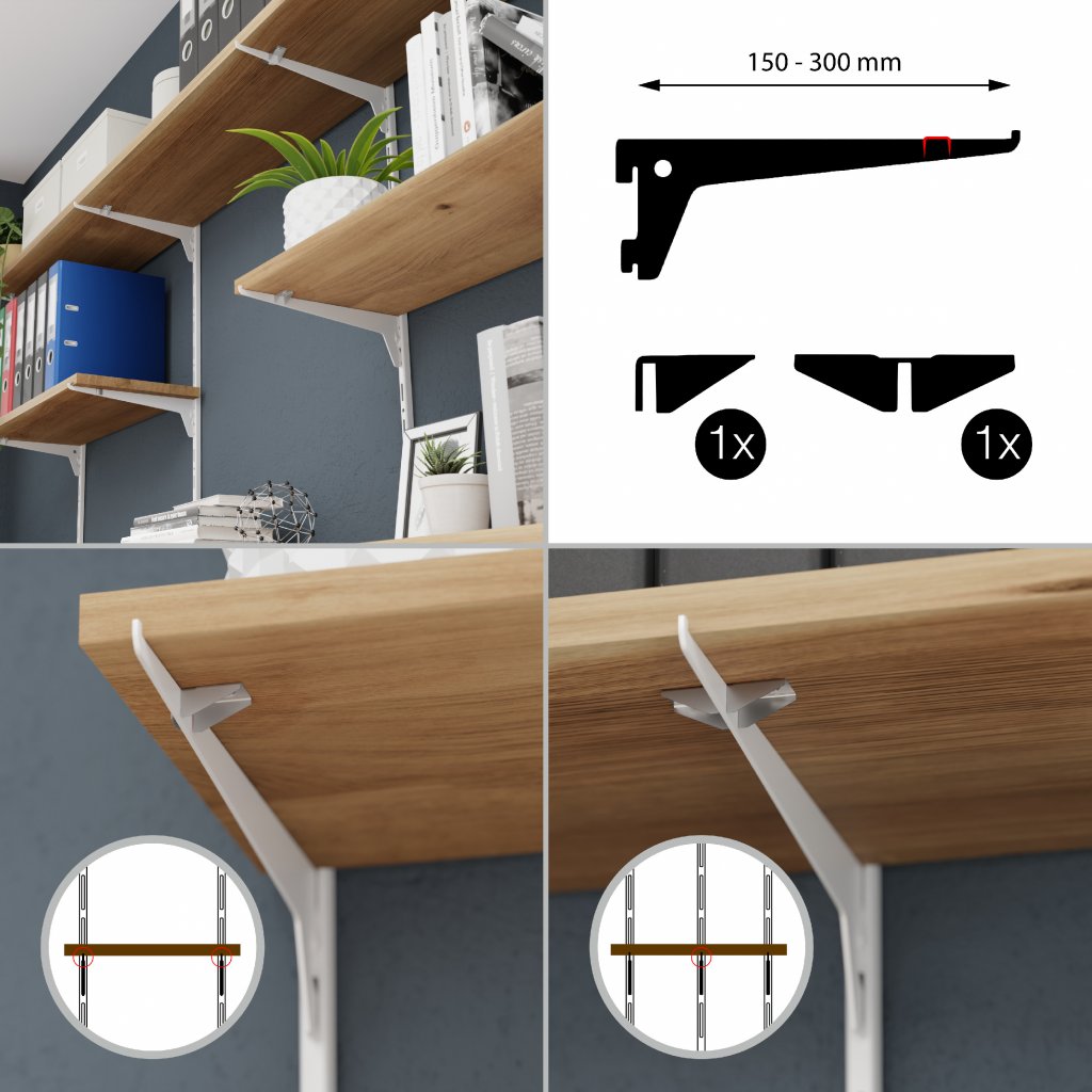 Kvalitně zpracovaný kovový nasazovací držák k připevnění dřevěné police.