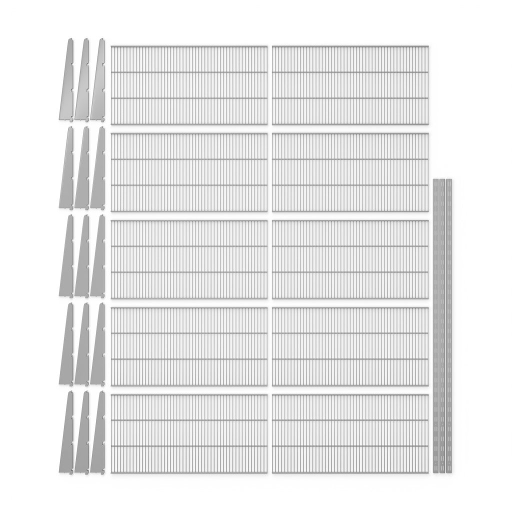 Regálový systém DOUBLE s výškou 1500 mm, šířkou 1630 mm a hloubkou 430 mm představuje robustní a praktické řešení pro přehledné uložení věcí ve dvou sloupcích. Díky perforovaným policím umožňuje proudění vzduchu – ideální pro šatní systémy nebo dlouhodobé skladování.