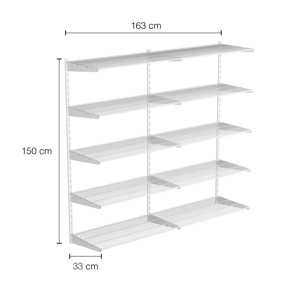 Regálový systém DOUBLE s výškou 1500 mm a šířkou 1630 mm představuje robustní a praktické řešení pro přehledné uložení věcí ve dvou sloupcích. Sestava je dostupná ve dvou hloubkách – 330 mm a 430 mm, takže ji lze snadno přizpůsobit velikosti prostoru i požadované kapacitě úložného systému. Díky perforovaným policím umožňuje proudění vzduchu – ideální pro šatní systémy nebo dlouhodobé skladování.