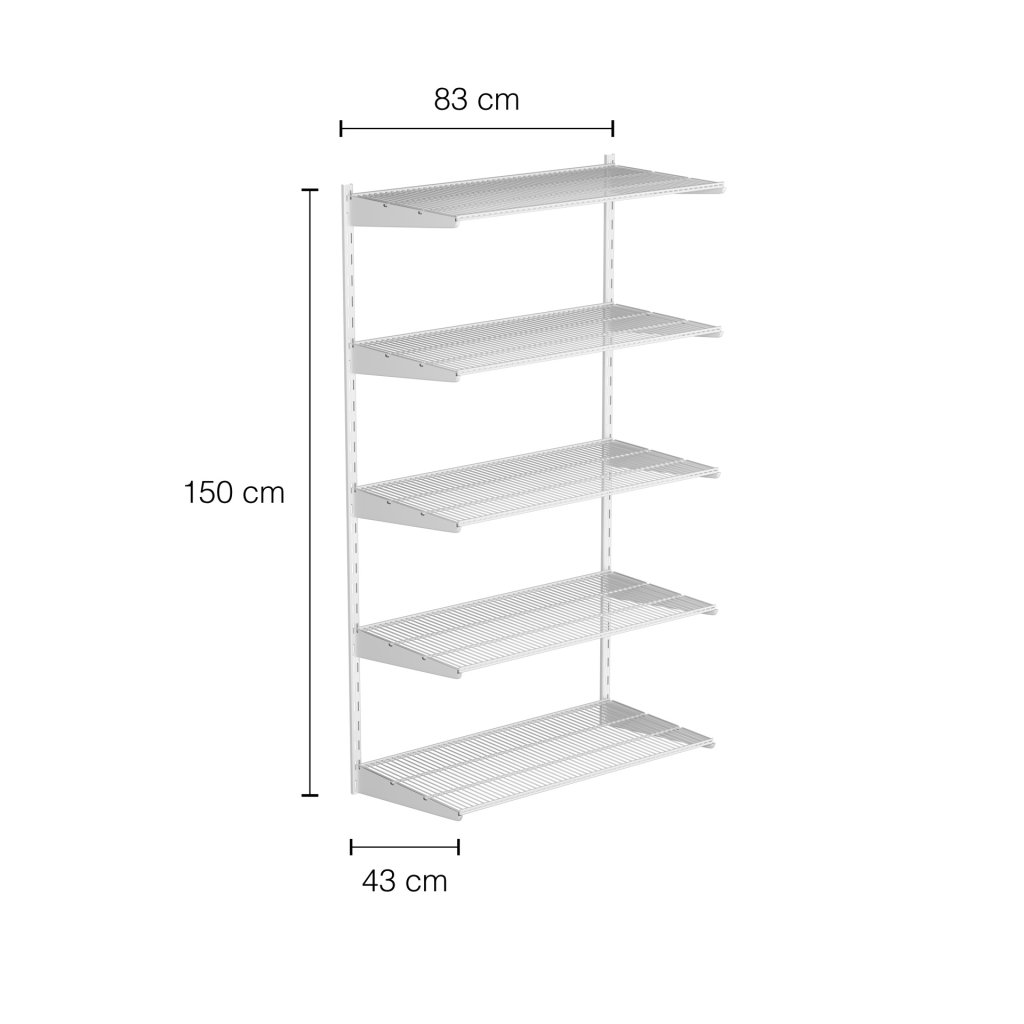 Univerzální nástěnný regálový systém SINGLE s výškou 1500 mm a šířkou 830 mm je praktickým řešením pro efektivní využití prostoru v jakékoli místnosti. Tato sestava je dostupná ve dvou hloubkách – 330 mm a 430 mm, takže ji lze snadno přizpůsobit velikosti prostoru i požadované kapacitě úložného řešení.