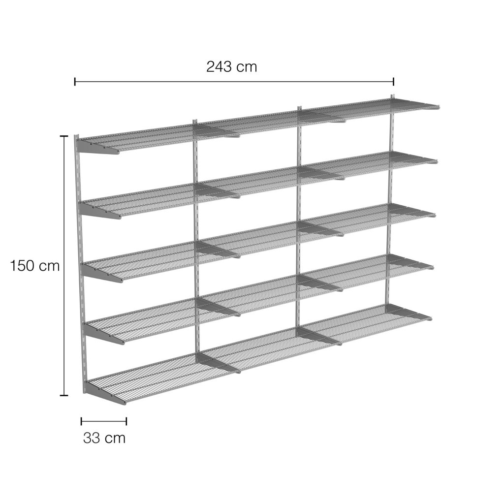 Nástěnný regálový systém – sestava TRIPLE 1500 × 2430 mm ve stříbrné barvě