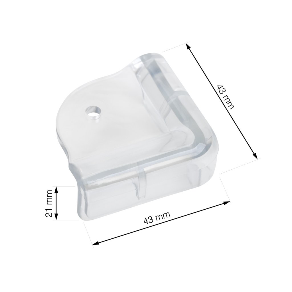 Tato ochrana rohů spojuje praktičnost, nenápadný design a jednoduchou aplikaci. Díky transparentnímu provedení se hodí do každého interiéru bez rušivého efektu. Rozměr 43x43x19 mm je ideální pro většinu běžného nábytku a v balení najdete hned 4 kusy pro komplexní ochranu.