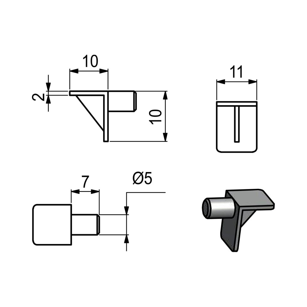 POUŽITÍ: Montáž je snadná a během chvilky hotová. Policové podpěry jsou vhodné pro zasunutí do předvrtaných otvorů o průměru 5 mm.