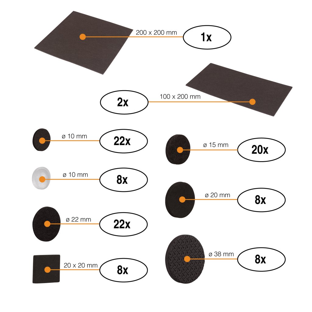 Filcové podložky: Ø 22 mm - 22x, Ø 15 mm - 20x, 100x200 mm - 2x, 200x200 mm - 1x.