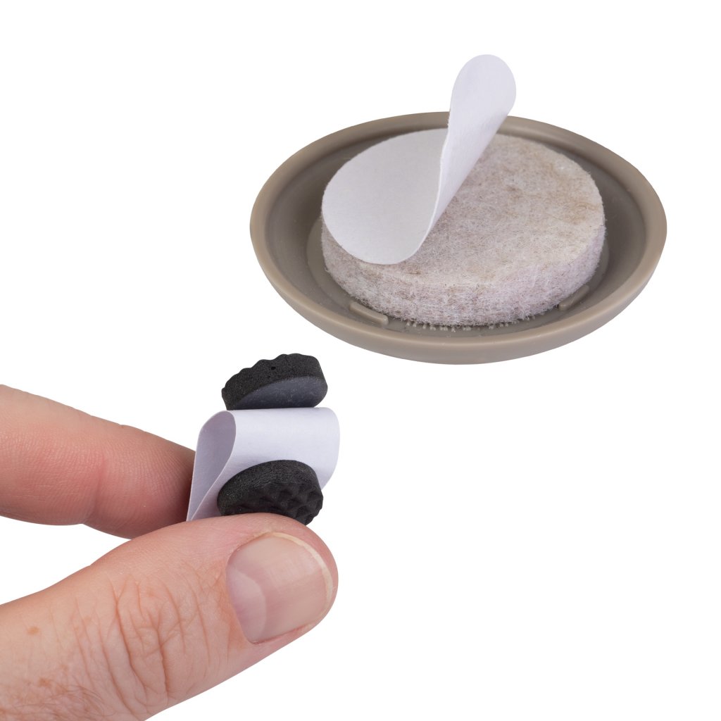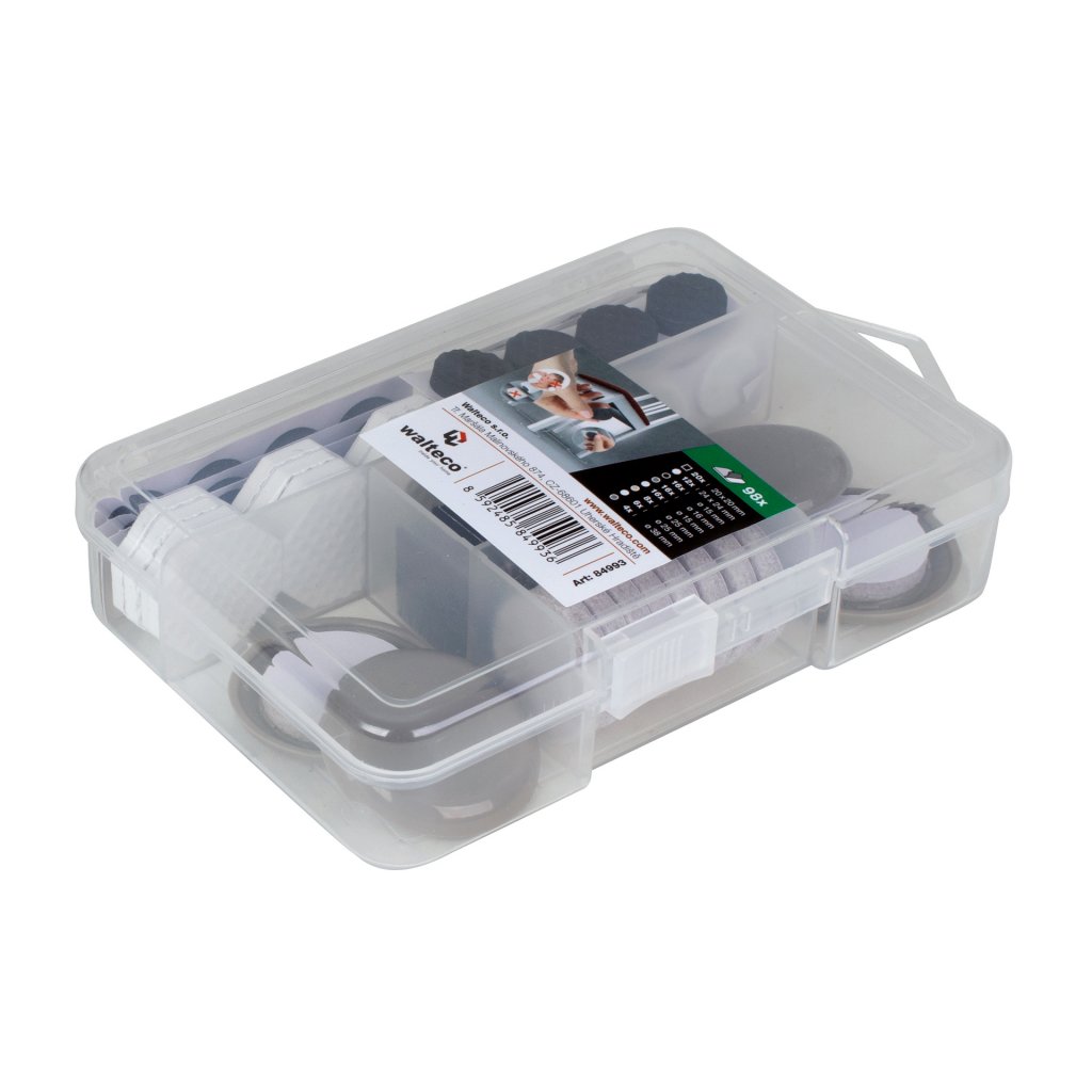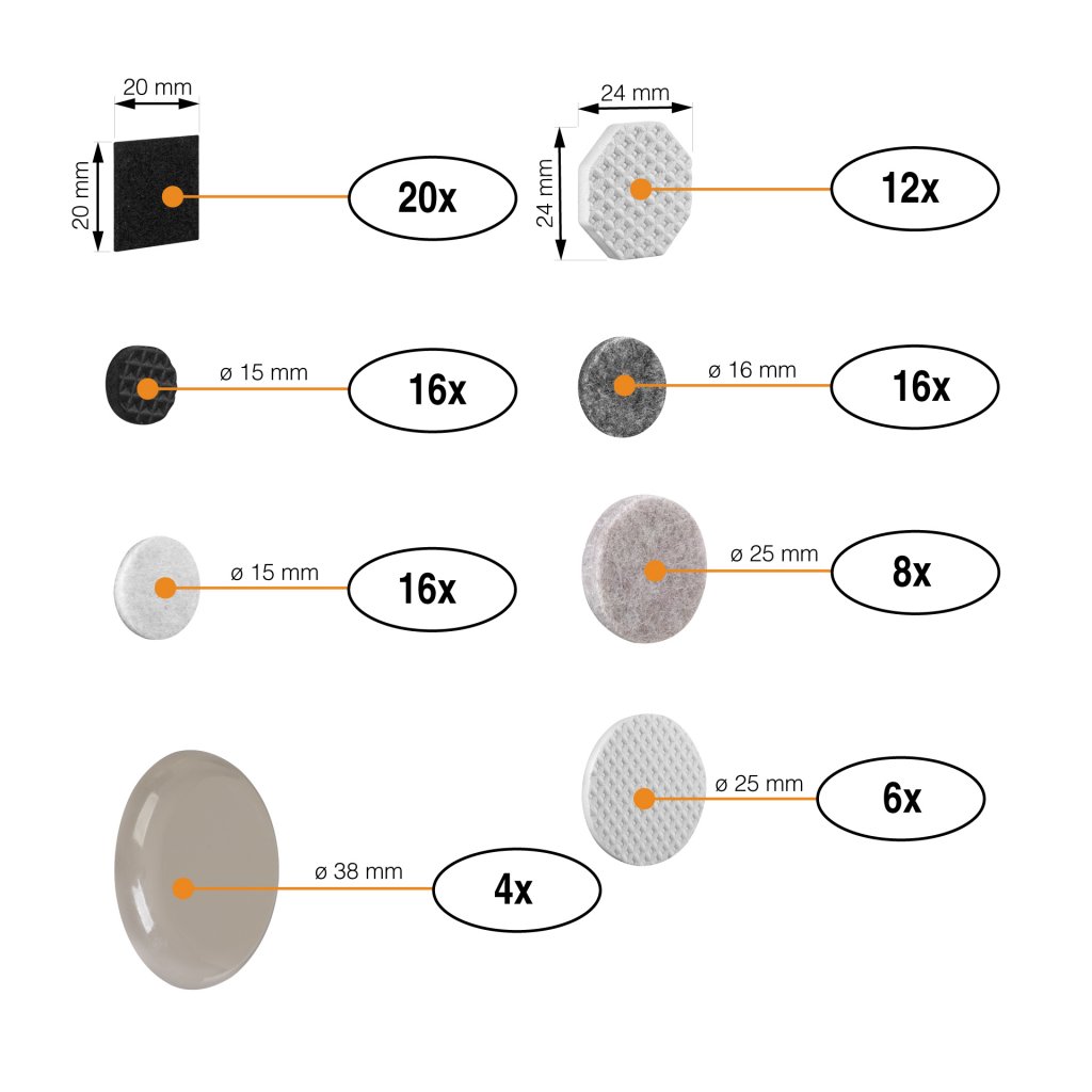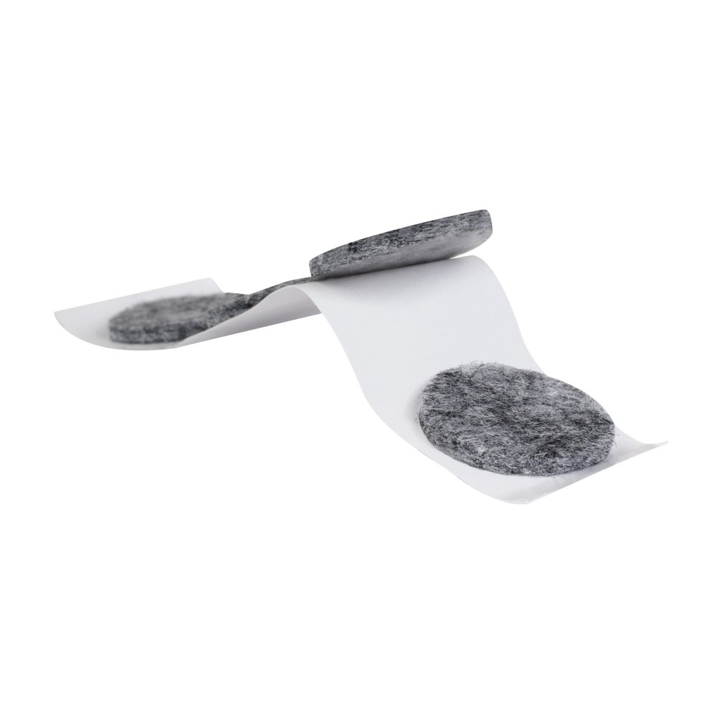 Filcové podložky: 20x20 mm černá - 20x, průměr 16 mm šedá - 16 ks, průměr 15 mm bílá - 16 ks, průměr 25 mm béžová - 8 ks.