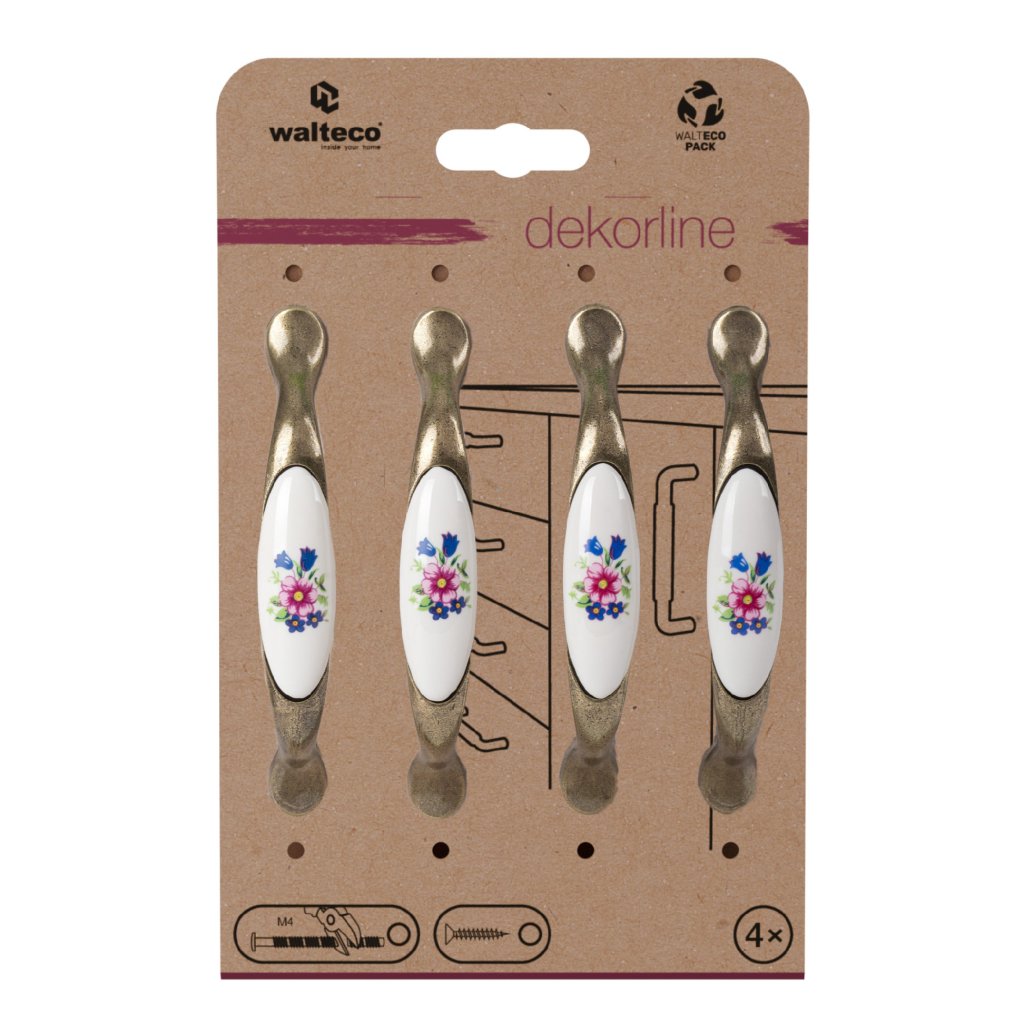Set nábytkových úchytek rozteč 96mm, antik mosaz/porcelán, kytice, 4 ks