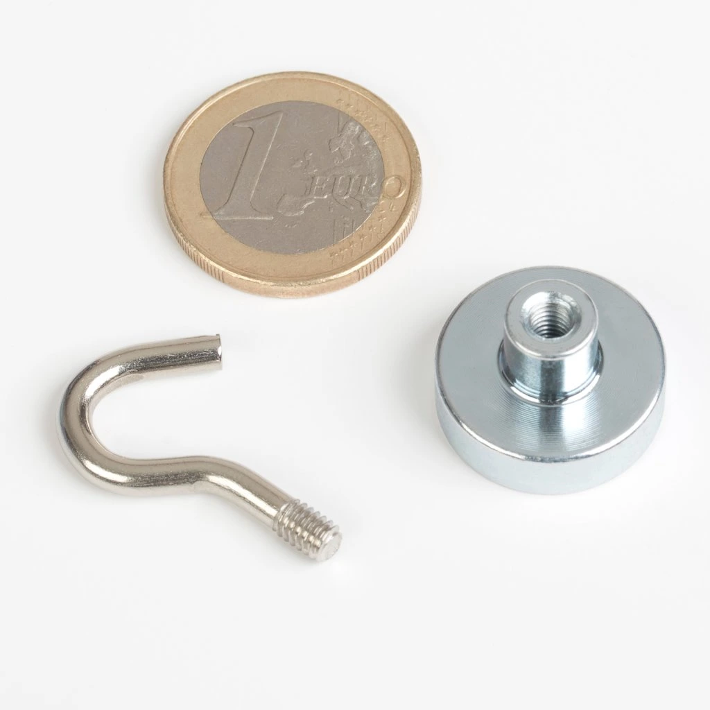 Magnet má vnútorný závit, na ktorom je priskrutkovaný oceľový hák.
