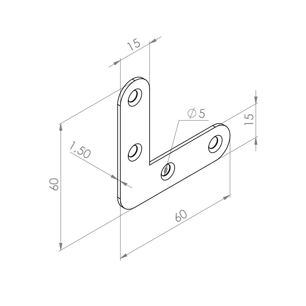 Spojovací úhelník vyrobený z oceli o tloušťce 1,5 mm. Průměr montážních otvorů pro hřebíky nebo vruty je 5 mm.
