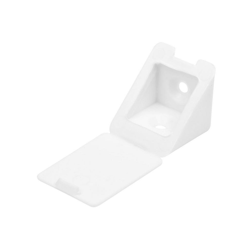 Úhelník vyrobený z plastu je opatřen dvěma zápustnými otvory pro uchycení. Po přišroubování se otvor s vruty překryje plastovou krytkou.