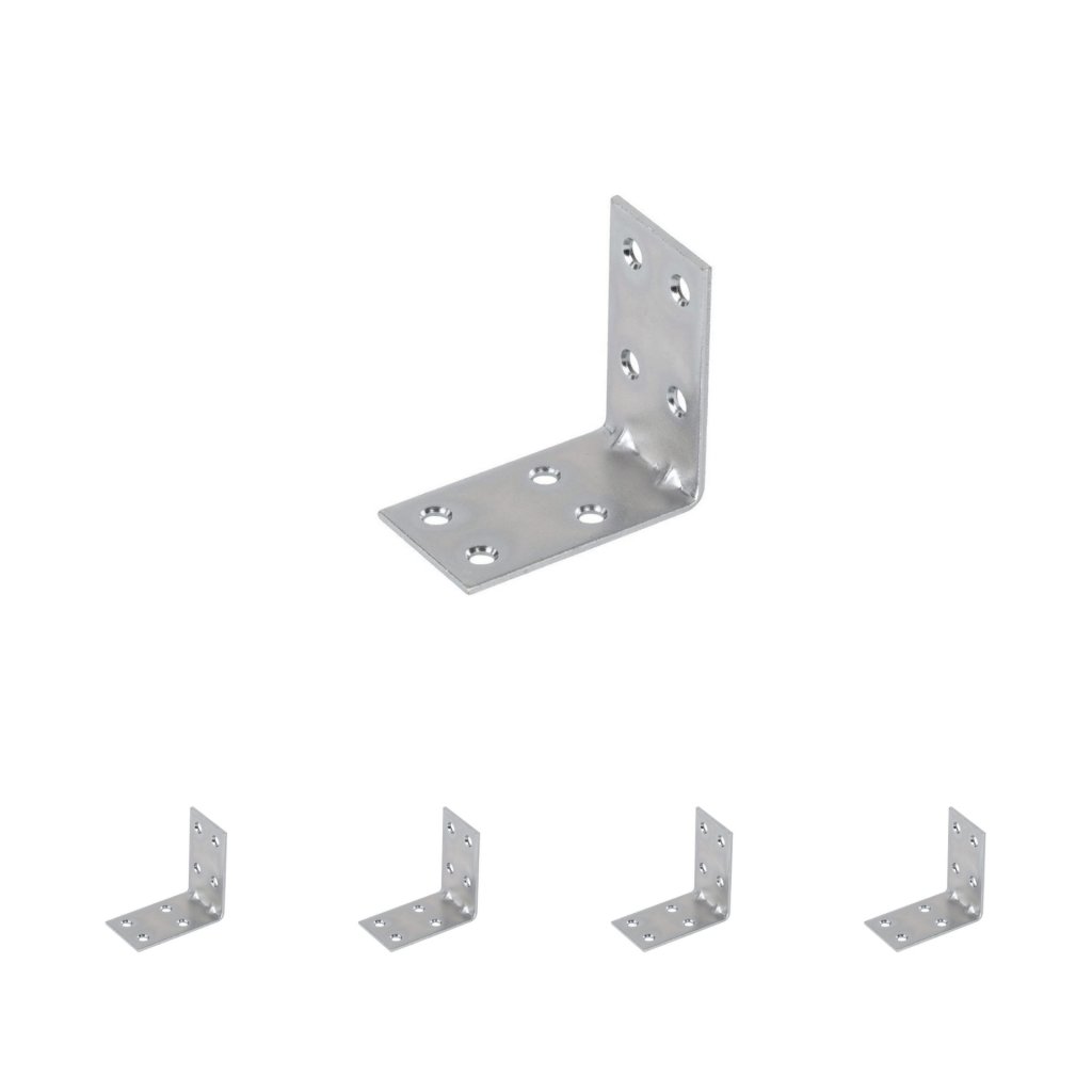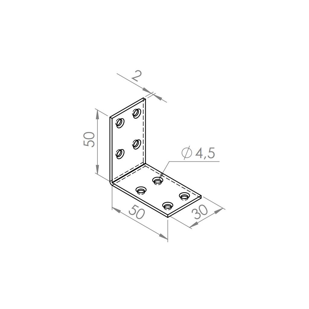 Spojovací úhelník vyrobený z oceli, oboustranně žárově zinkovaný o tloušťce 2 mm. Průměr montážních otvorů pro hřebíky nebo vruty je 4,5 mm.
