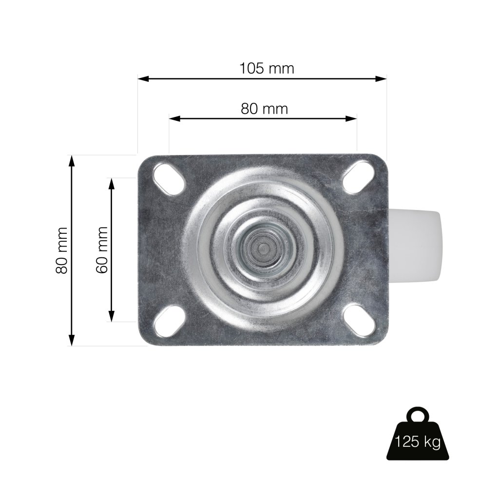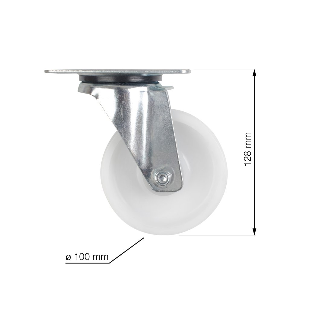 Otočné transportní nylonové kolečko o průměru 100 mm s dynamickou nosností 125 kg.