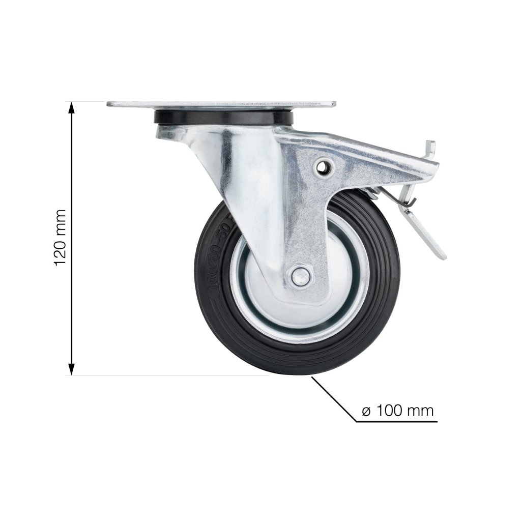 Otočné transportní kolečko s brzdou o průměru 100 mm s dynamickou nosností 70 kg.