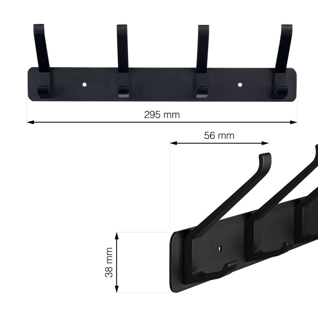 Věšáková lišta, 4 háčky, 295mm, aluminum, matná černá