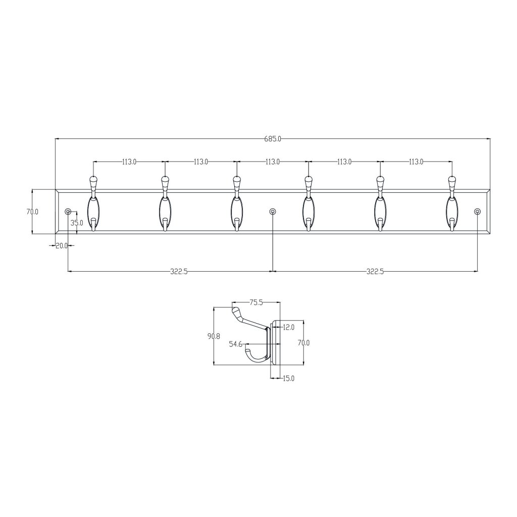 Tato věšáková lišta je určena k přišroubování na zeď a hodí se do vstupní haly, šatny, kuchyně, koupelny i ložnice. Skvěle se kombinuje s nábytkem v podobném dekoru dřeva. Lišta má šířku 685 mm, výšku 90 mm (včetně háčků) a hloubku 76 mm, je vybavena šesti kovovými háčky v matné bílé barvě. Rozteč mezi otvory je 322,5 mm.